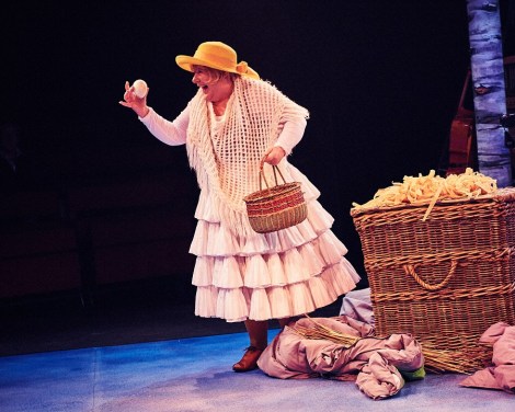 Emily May Smith as Duckie bursts out of her shell into a world in which she doesn’t fit, save for the undying love of Mother Duck played with waddling wonderfulness by the be-hatted and non celeripedean Heather Williams who sings: “You are beautiful, I’ll tell you again and again.” Then there are her brothers and sisters as well as various farm animals who insult, ignore and reject Duckie as a member of the pond side community. Bullied and confused she sets out on a journey of self-discovery. Hans Christian Anderson’s 19th century story of social exclusion and of being an individual in a regulated world connects with us all in that universal feeling of wishing to be included. Duckie is confused when she is shunned by her peers and cries: “I don’t belong here.” In the hands of Travelling Light the moral fable reminds us all to be ourselves, that everyone is of value and will eventually have the confidence if nurtured to leave the bosom of our mother’s downy love and take flight into the world.