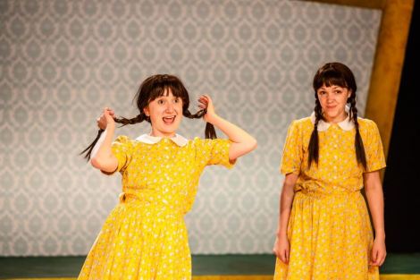 The twins’ costumes – for the majority of the play, they are in matching yellow floral blouses with a Peter Pan collar, first with dungarees then a matching long skirt – seem an oddly antiquated choice, particularly as they bop around to Ariana Grande and Little Mix. (In the book, they used to wear Gran’s frilly home-made frocks before her arthritis got worse and they happily made the switch to shop-bought stuff). Throughout her career, Jacqueline Wilson has aimed to depict the reality of children’s lives, and the events of Double Act could certainly have taken place today, so having Ruby and Garnett look so unlike the audience in front of them unnecessarily separates their world and ours.