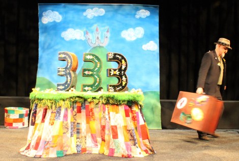 The sets are ingenious, and Lawrence’s engagement with them ensures that they are practically suited to playing in front of a large crowd. Each story emerges from a painted number 3 – puppets (cleverly animated as Lawrence’s two fingers become their legs) live inside, and the 3 frame becomes the front doors of the pigs’ homes, or the chimneys of the bears’ cottage. Lawrence brings the action out into the audience as often as possible – the pigs scurry over heads and shoulders as they run away from the wolf, and the door of Ziggy Piggy’s brick home is opened wide and paraded around so that everyone can get a good glimpse of the wolf’s bottom dangling perilously close to the recently lit fire inside.