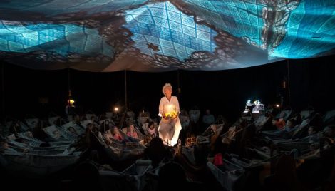 I’m lying in a hammock, swinging gently from side to side, while Bodil Alling recounts the tale of Androcles, the slave who escapes to the desert to avoid being thrown to the lions. Trickling water, sweeping sands, looming shadows and sparkling stars are cleverly projected onto the canopy overhead. Below, the sounds of birdsong and buzzing flies, marching soldiers and jeering crowds, evoke Ancient Rome. It’s like the very best bedtime story; calm, quiet, intimate and intense, you can almost feel the audience’s breath and heart beats slowing and synchronising as we rock to and fro in the dark. Immersive, ambitious and visually stunning, Teatret Gruppe 38 and Carte Blanche’s Androcles and the Lion is the perfect introduction to this year’s bOing! International Family Festival.