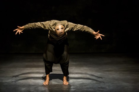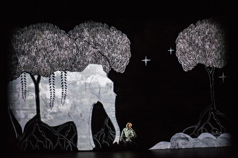 Chotto Desh takes us to the busy Bangladesh streets Akram visited during school holidays, the dancer’s energetic movement singlehandedly peopling the stage with bicyclists, beggars, traffic conductors and pedestrians. He draws a face on top of his shaved head, which he keeps bent forward, stroking and cradling his forehead like a chin, an inventive and funny introduction to Akram’s overbearing father. But, in a show that seems to get more and more beautiful as time goes by, the visual highlight is the giant animations that bring the fable of The Honey Hunter to life. The dancer cleverly interacts with the projections so that he seems to sail across oceans, snatch fish from the jaws of a crocodile, and climb through the forest in a fateful search forbidden by the gods.