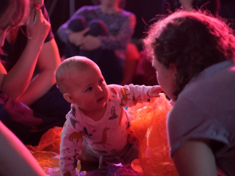 Sarah Forbes (soprano), Catherine Carter (mezzo) and Jenny Gould (piano, voice and composer) have plenty of experience working with, and creating and performing for, children. Notably, both Forbes and Carter were part of Katherine Morley’s celebrated 16 Singers, an in-the-round, through-composed performance for 0-18 month olds and their parents that blended movement, rhythm, breath and song. The trio’s familiarity with this type of work and audience really shows: they have a lovely way about them, the show a series of gentle interactions with, and delightful responses to, the babies who take up their invitation to play, or toddle, mesmerised up to them as they sing. Rarely have I seen such a young audience so comfortable, captivated and curious.